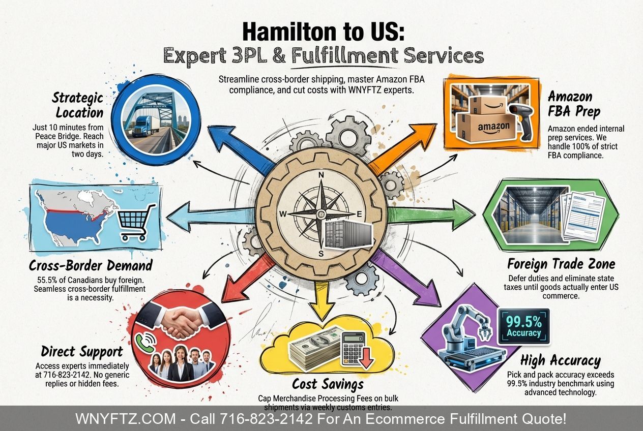 I’m going to walk you through exactly how HAMILTON ONT Ecommerce Fulfillment & 3PL Services 2026 can solve these challenges for your business. You’ll discover how WNYFTZ services like Amazon FBA prep, pick and pack, and Foreign Trade Zone benefits can cut your time and lower your costs.